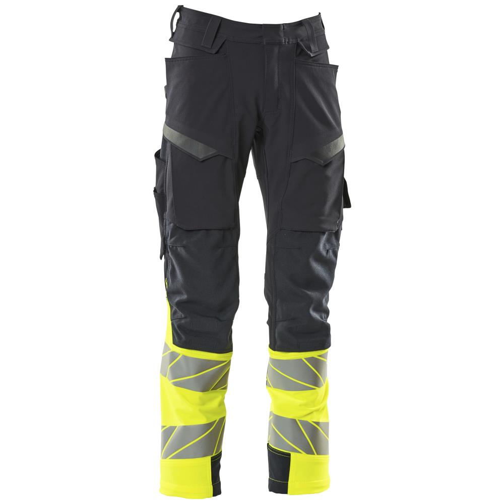 Fluorescerende kontrastfarve og med reflekser. Har en vandafvisende finish. Tofarvet. Ultimativt strækstof med lav vægt og god slidstyrke. Tonålssømme på ben og i skridt. Knaplukning er skjult. Bukseben er ergonomisk formede. Bæltestropper. Gylp med lynlås. Forlommer. Baglommer med forstærkninger. Skjult hammerstrop i højre side. Forberedt til hængelommer 19450-126, der påsættes med knapper. Tommestok lomme med Kevlar-forstærkninger. Lommer med klap foran på lår. Knælommer i super slidstærk CORDURA (1000 D) er regulerbare. Nem, individuel regulering af knælommens højde. Lårlomme med foret telefonlomme, skjult trykknaplukning og integreret ID-kortholder. ID-kortholder er aftagelig. Lodret lynlås med mulighed for ventilation på baglår. Med printeffekter. Skridtlængden kan forøges med 3 cm ved at fjerne den indvendige, røde syning ved fod. Certificering: EN ISO 20471 – klasse 1, Hi-Vis gruppe Z. Fås i flere varianter.