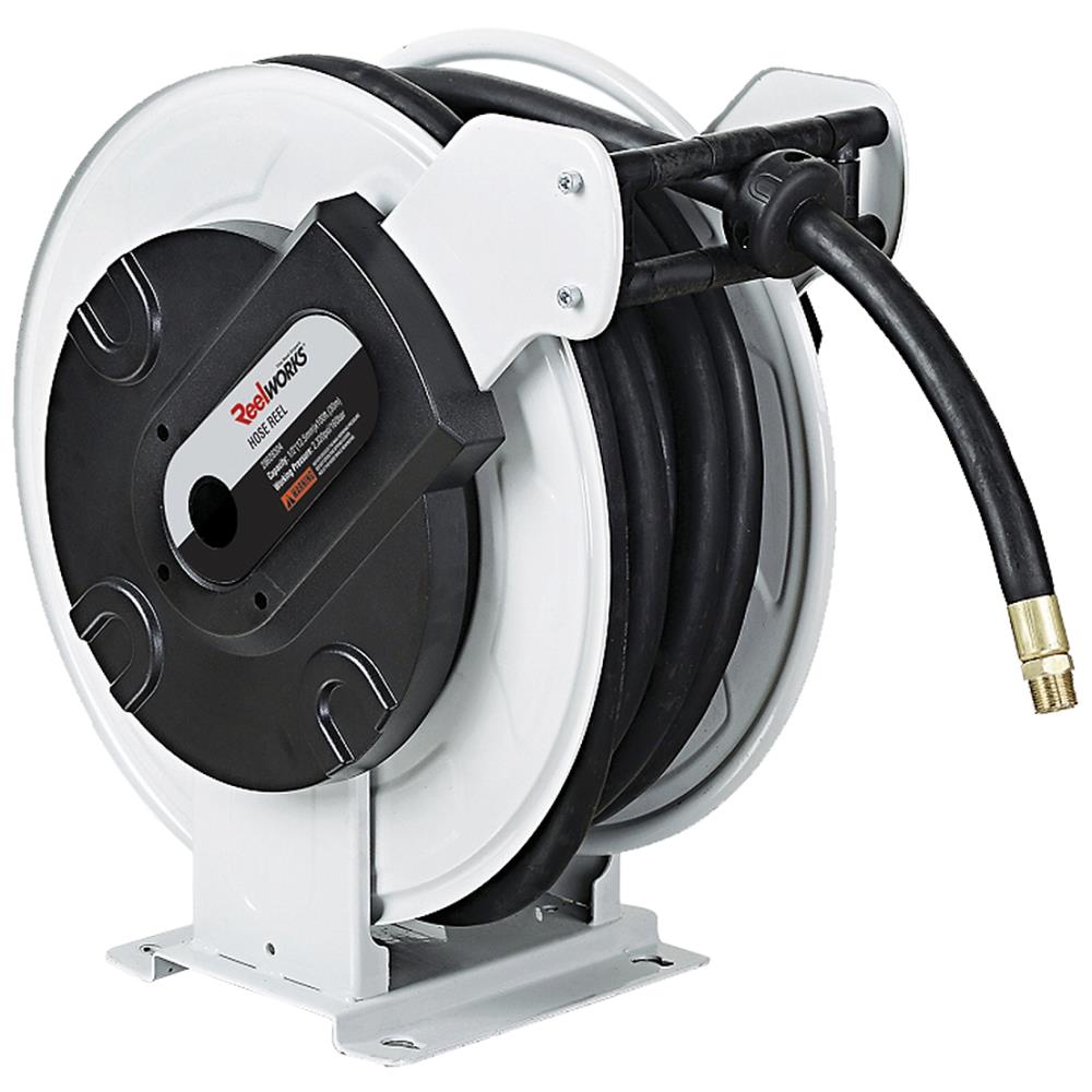 Serie 627 automatisk slangeopruller for luft/vand. Oprulleren har forstærket fjeder og er udført i ekstra kraftig plademateriale med Epoxy-pulverlakering. Styrearm med fire retningsruller, justerbar i ni forskellige positioner. Monteret med SBR gummislange, maks. temperatur 60°C (højtryksopruller maks. 100°C).