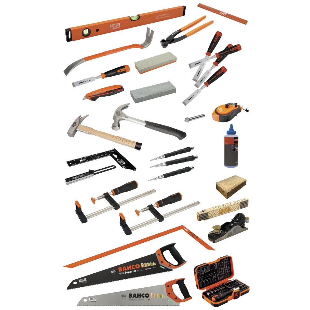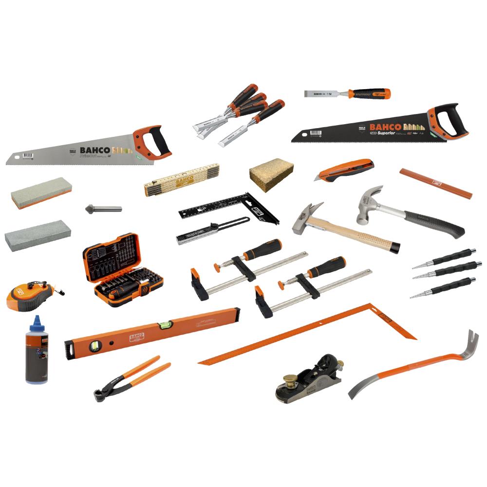 Værktøjssæt til tømrerlærlinge. Sættet indeholder: Blokhøvl (BP-40), 82 mm afbindingsjern (434-28-M), 6 mm stemmejern (434-6), 12 mm stemmejern (434-12), 16 mm stemmejern (434-16), 25 mm stemmejern (434-25), K120/K400 slibesten (528-COM), slibesten natursten (528-700), 22″/550 mm Superior Ergo håndsav (2600-22-XT-HP), 22″/550 mm Prizecut håndsav (NP-22-U7/8-HP), 750 g lægtehammer (485W-750), 450 g kløfthammer (429-16), 800 mm tømrervinkel (FCS-800), 250 mm ansatsvinkel (9045-B-250), 200 mm smigvinkel (9572-200), 220 mm bindetang (2339DIP), 2 mtr. tommestok (WR2-12), tømrerblyant (P-HB), 36 dele bits-/topsæt (59/S36BCR), undersænker (4435-12.4), 18 mm “bræk-af” hobbykniv (KB18-01), 2 mm dyknagle (SB-3732-2-125), 2,5 mm dyknagle (SB-3732-2,5-125), 3,2 mm dyknagle (SB-3732-3,2-125), 625 mm koben (WBP625), 800 mm vaterpas (416-800), kridtsnor (CL-1221), 227 g blå pulverkridt (CHALK-BLUE), kork slibekolds (SBC110-65), 2 stk. 120×300 mm skruetvinge (420SH-120-300). Leveres uden kasse.