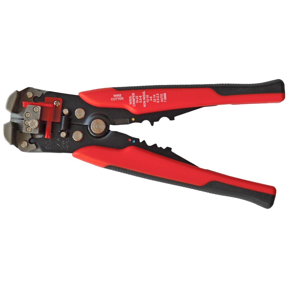 Kombineret afisolerings- og kabelskotang. Selvjusterbar stop kontrollerer længden af kablet. Afisolerer og klipper 8-30 AWG. Kabelsko isoleret 10-22 AWG 1,5-6,0 mm². Uisoleret 10-12+4-6+22-14+0,5-2,5. Kabelsko auto tændingsterminal 7-8 mm.
