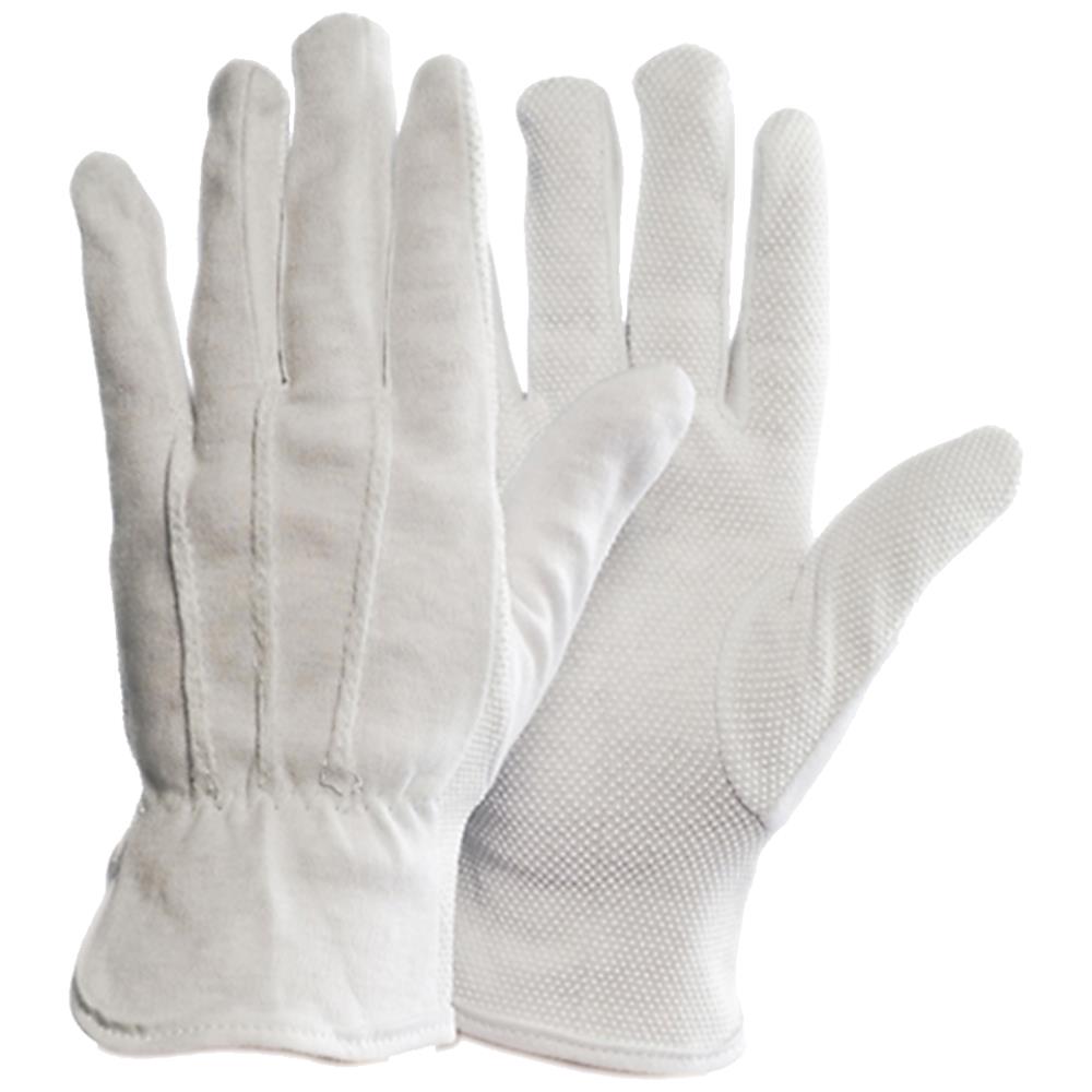 Strålesyet handske af bleget bomuld med minidotter. God pasform og brugeren har god fingerføling. Minidotterne er næsten usynlige, men de giver et forbedret greb om glatte emner. 320 gram bomuld per dusin. Længde: 23 cm. CE Cat. I, EN 420:2003+A1:2009. Fås i str. 6-11.