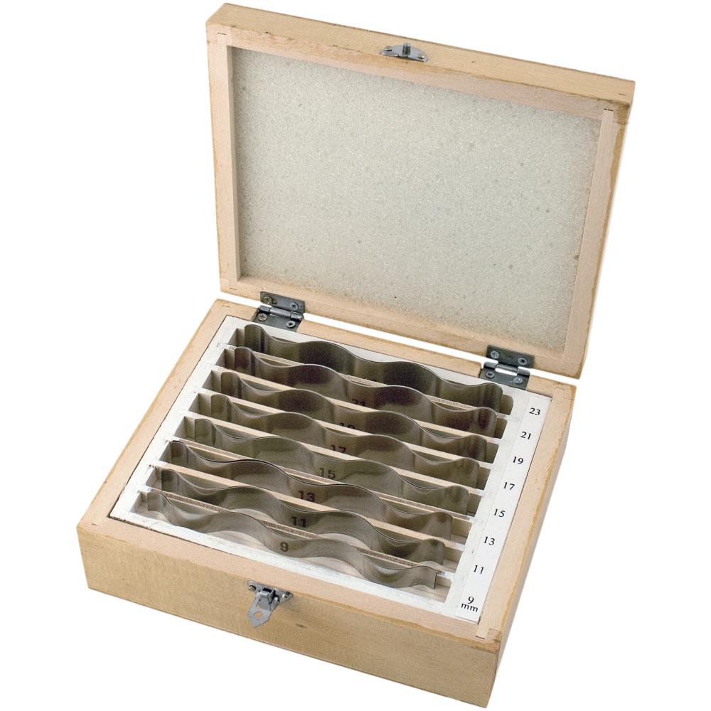 8 par bølgede parallelklodser af hærdet fjederstål. 2 mm spring. 110 mm længde. Fås i flere varianter.
