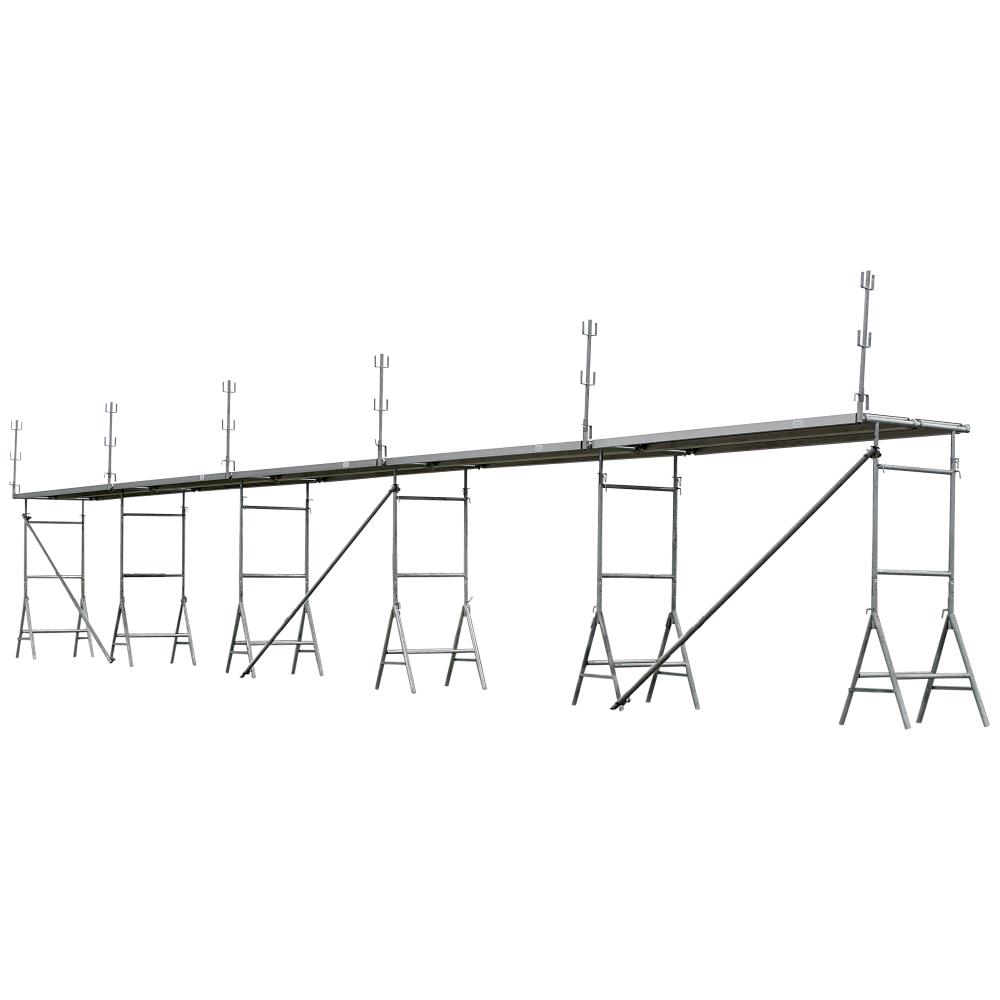 Komplet bukkestillads bestående af 305 cm platforme, murerbukke, 1 mtr. forhøjere, gelænderstolper, fodsparkholdere, diagonaler og vægfastgørelser. Denne model er 1,2 mtr. bred med 4,90 mtr. arbejdshøjde og 2,90 mtr. ståhøjde. Fås i flere størrelser.