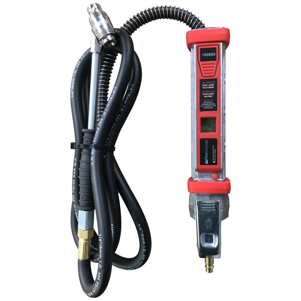 Pumpepistol til luft. Støbt i aluminium med digital manometer (0-12 bar), langt håndtag, to mtr. slange og lukkeventil. Kapacitet: 200 ltr./min., maks. tryk 15 bar.