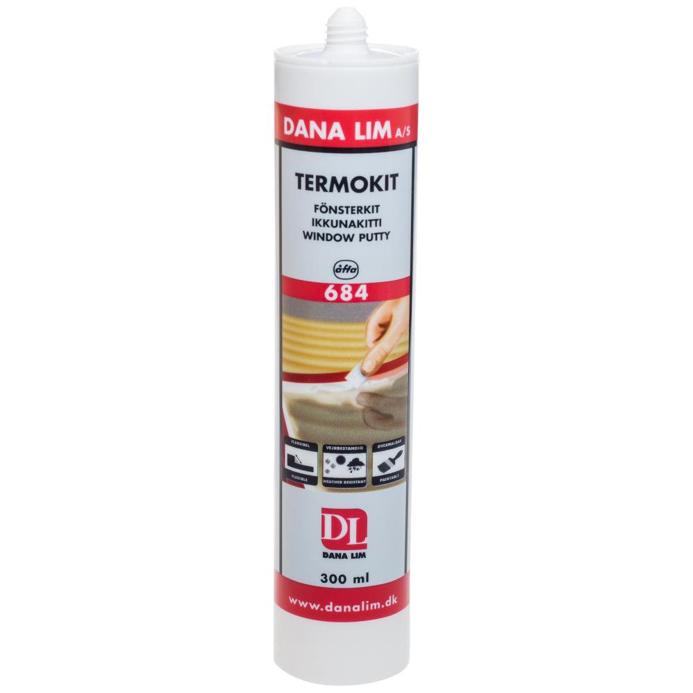 Termokit 684 er en stabiliseret og plastisk specialkit, fremstillet på basis af polymeriserede vegetabilske olier med tilsætning af kunstgummistoffer. Kittet hærder under optagelse af ilt. Produktet anvendes til kitning og reparation af vinduer med både enkeltglas og isoleringsruder. Hæfter fast og beskyttende på glas, metal og træ. Termokit 684 afbinder med en beskyttende hinde efter nogle dage, og herunder forbliver kitmassen plastisk igennem år. Termokit 684 kan overmales og er tixotropisk – nem at arbejde med.