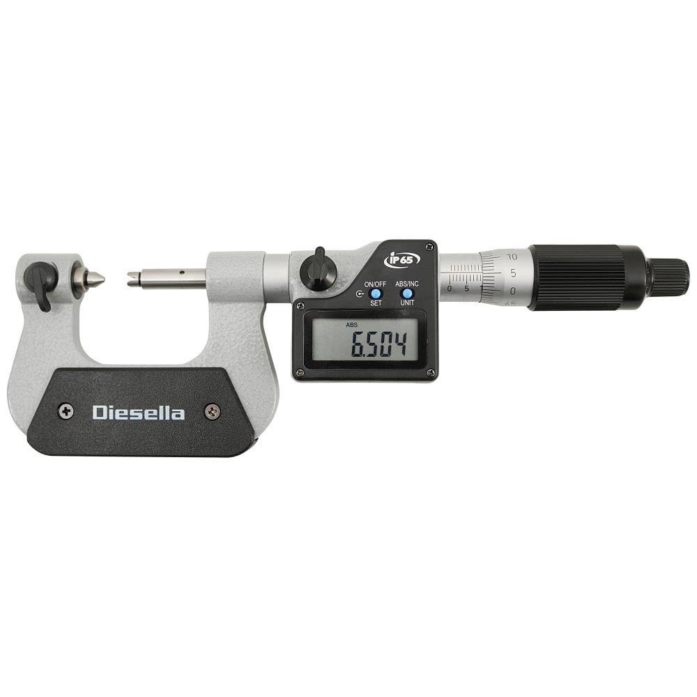 Digital mikrometer til udvendig måling af gevinddiameter med udskiftelige V-formede og kegleformede indsatser. Bøjle med matforkromet skala, friktionsskralle og spindellås. Tolerance iht. DIN 863. IP65. Aflæsning 0,001 mm. Bruger 1× LR44 batteri (medfølger). Leveres i plastkasse. Fås i flere varianter.