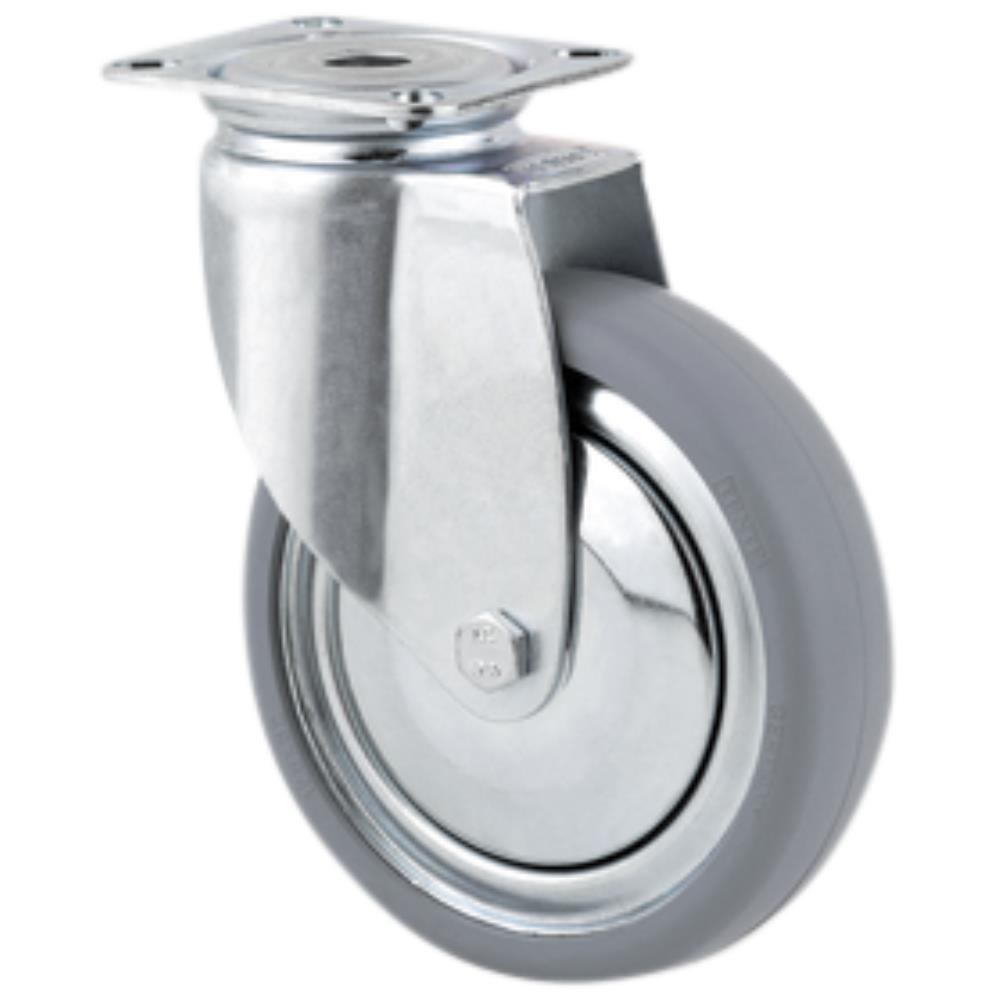 Drejeligt hjul med gaffel i medium stålplade med bred gaffelform og nittet dobbel kuglekrans. Hjulfælg i svejst stål og hjulbane i massiv afsmitningsfri gummi samt konus-kugleleje. Med eller uden bolthul. Fås i flere dimensioner.