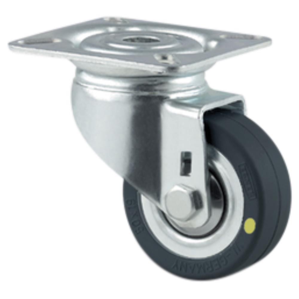 Drejeligt hjul bred gaffel i medium stålplade med nittet dobbelt kuglekrans. Svejst stålfælg med massiv sort ESD gummi samt konus-kugleleje. Med centerhul- eller pladebefæstigelse. Fås i flere dimensioner.
