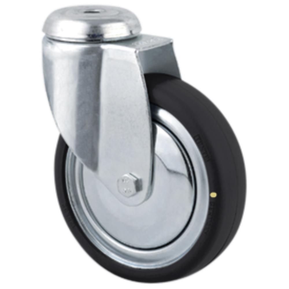 Drejeligt hjul bred gaffel i medium stålplade med nittet dobbelt kuglekrans. Svejst stålfælg med massiv sort ESD gummi samt konus-kugleleje. Med centerhul- eller pladebefæstigelse. Fås i flere dimensioner.