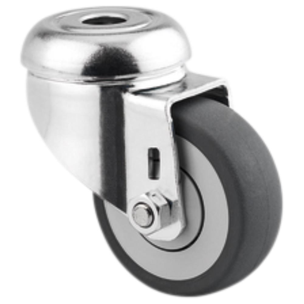 Drejeligt hjul med gaffel i medium stålplade med bred gaffelform og nittet dobbel kuglekrans. Hjulfælg i polypropylen PP med termoplastisk gummi. Fås med glide- eller kugleleje. Centerhulsbefæstigelse. Fås i flere dimensioner.