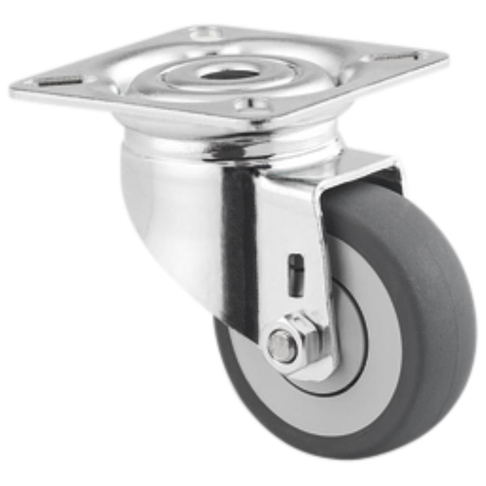 Drejeligt hjul med gaffel i medium stålplade med bred gaffelform og nittet dobbel kuglekrans. Hjulfælg i polypropylen PP med termoplastisk gummi. Fås med glide- eller kugleleje. Centerhulsbefæstigelse eller plade. Fås i flere dimensioner.