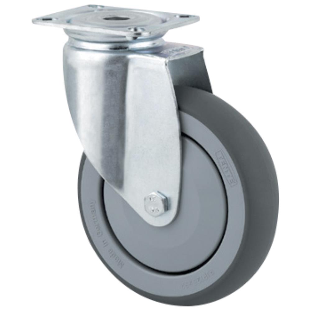 Drejeligt hjul med gaffel i medium stålplade med bred gaffelform og nittet dobbel kuglekrans. Hjulfælg i polypropylen PP med termoplastisk gummi. Fås med glide- eller kugleleje. Centerhulsbefæstigelse eller plade. Fås i flere dimensioner.
