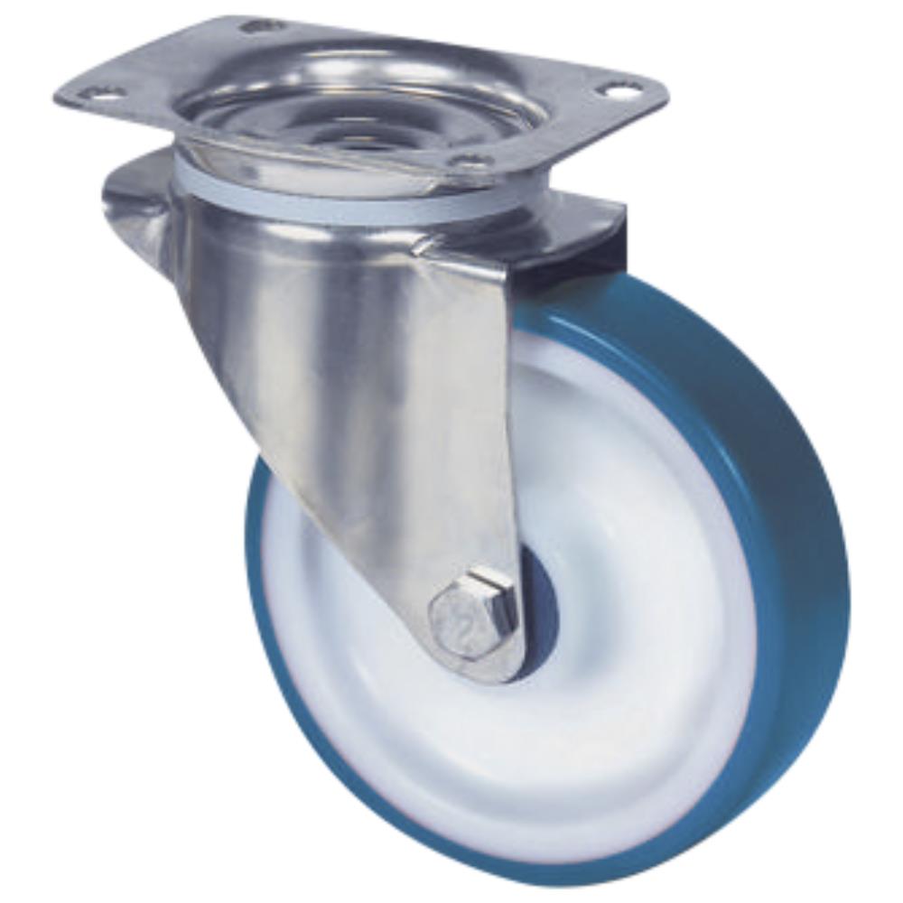 Drejeligt transporthjul i rustfri med bred gaffel og nittet dobbelt kuglekrans. Nav i polyamide med polyuretan hjulbane og rustfrit rulleleje. Med centerhul- eller pladebefæstigelse. Fås i flere dimensioner.