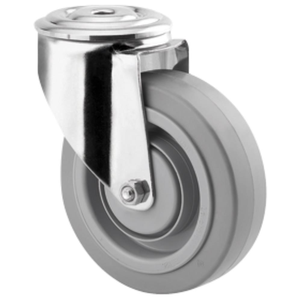 Drejeligt transporthjul i rustfri med bred gaffel og nittet dobbelt kuglekrans. Nav i polyamide med elastisk gummibane samt DIN-kugleleje med gummitætning. Med centerhul- eller pladebefæstigelse. Fås i flere dimensioner.