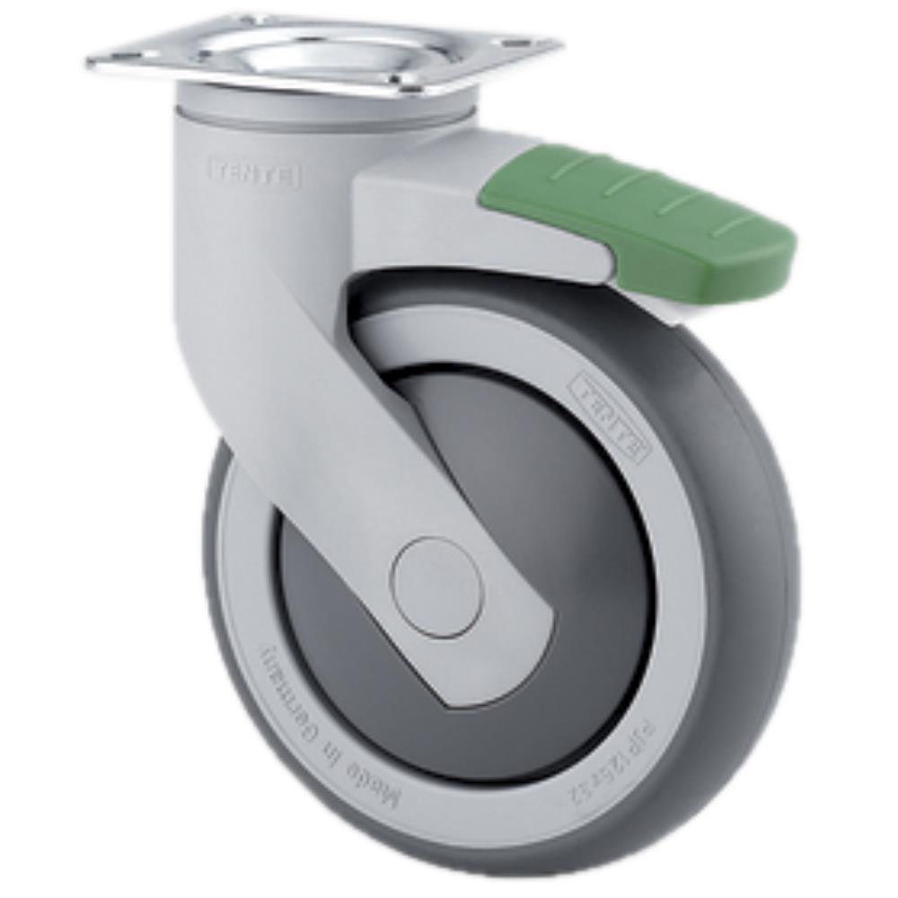 Drejeligt hjul med retningsbremse, kunststof. Med dobbelt kugelkrans. Med polypropylen fælg med termoplastisk gummi og DIN-kugleleje. Med centerhulsbefæstigelse eller plade. Fås i flere dimensioner.