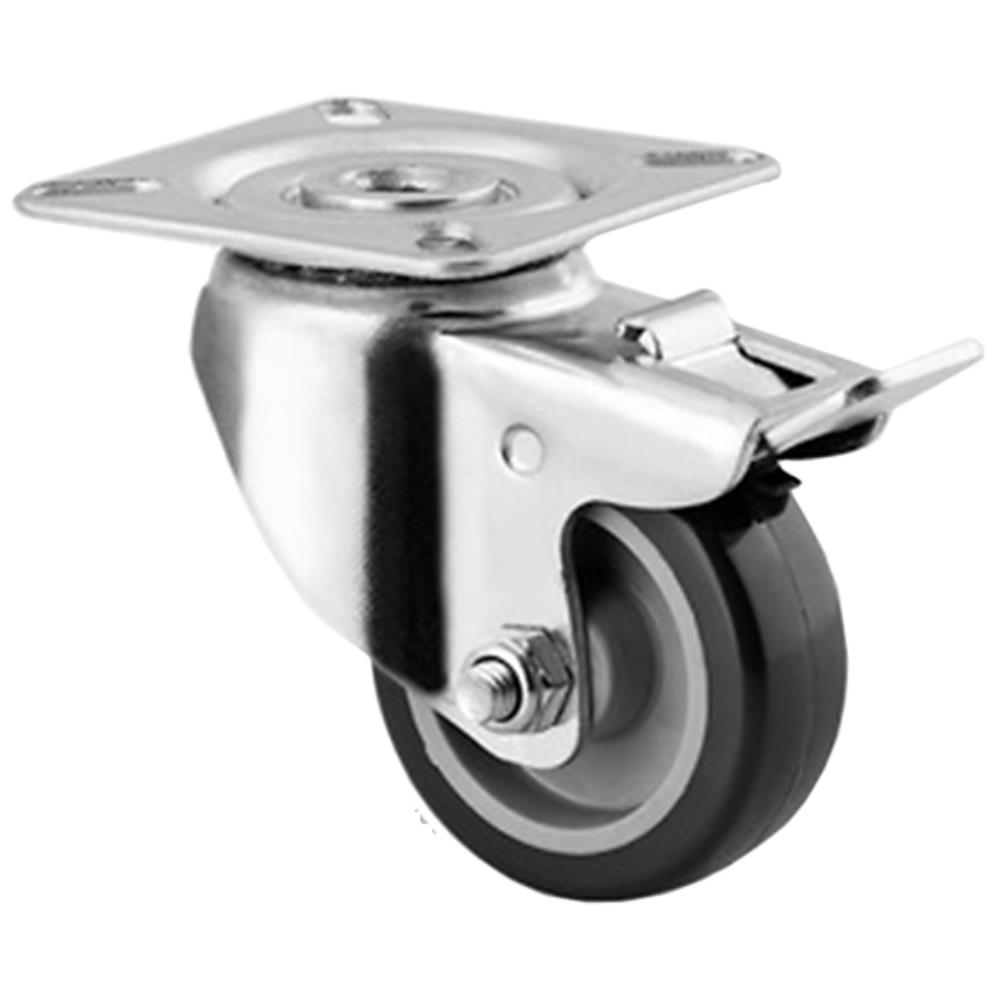 Drejeligt hjul med bremse, let stålplade med bred gaffel og dobbelt kuglekrans, nittet. Gummihjul med glideleje uden trådfang. Med centerhulsbefæstigelse eller plade.