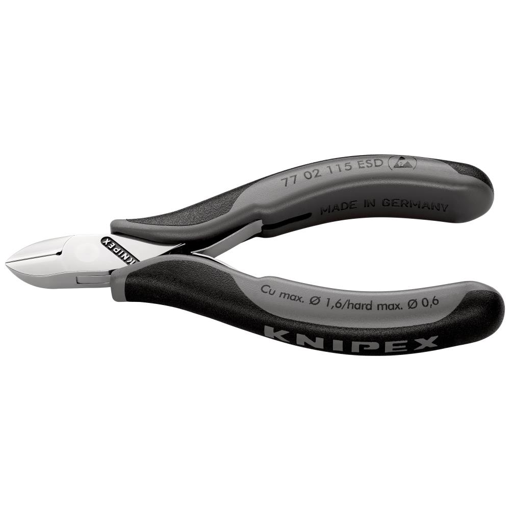 Elektronik-skævbider ESD med flerkomponent-håndtag 115 mm. For fine skærearbejder, f.eks. inden for elektronik og finmekanik. Greb elektrisk ledende, dissipativ. Stabilt, gennemstukket og spillerumsfrit led. Friktionsfattig dobbeltfjeder for blød og ensartet åbning. Spejlpolituren giver i forbindelse med en fin oliefilm en god rustbeskyttelse, så ingen forstyrrelser i koblingskredsløbet pga. af afskallende kromdele. Skær yderligere induktivt hærdede, skærhårdhed ca. 62 HRC. Greb med tofarvede flerkomponent-håndtag sort/grå. Special-værktøjsstål af særlig kvalitet, smedet, oliehærdet. Rundt hoved, med lille facet.