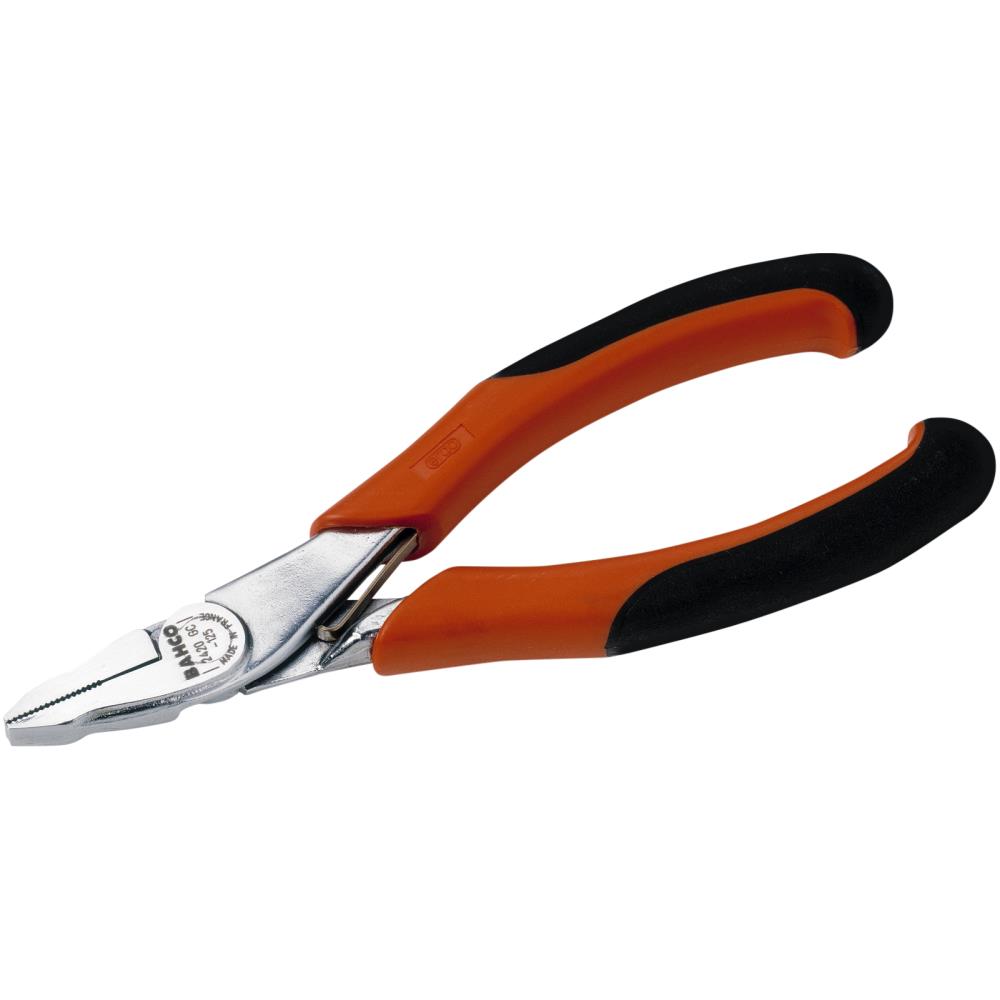 Fladtang med korte kæber, som gør tangen velegnet til opgaver hvor pladsen er trang. Kæberne er flade og rektangulære med tværriflede gribeflader. Tangen er forsynet med returfjeder med on/off-funktion. Fremstillet af højtlegeret stål med rustbeskyttet, sort finish og ergonomisk tokomponent håndtag med store grebsflader. ISO 5745 standard.