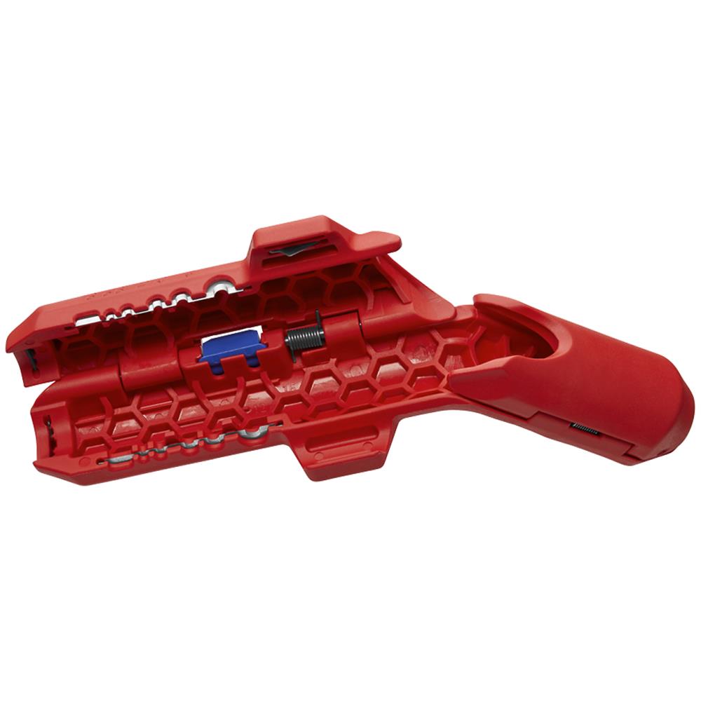 KNIPEX ErgoStrip universal afisoleringsværktøj. For hurtig og præcis afisolering af alle almindelige runde kabler og fugtrumskabler (f.eks. NYM-kabler 3×1,5 mm² til 5×2,5 mm²), datakabler (f.eks. Twisted-Pair) og koaksial-kabler. Innovativt, ergonomisk pistolgreb-design for nem indskæring, aftrækning og skæring af indkapslingen på langs. Konisk slankere værktøjsender for bedre adgang ved trange pladsforhold. Afisoleringsudstyr for tværsnit 0,2 / 0,3 / 0,8 / 1,5 / 2,5 / 4 mm². Nemmere at indsætte enkeltledere til afisolering pga. positioneringstop. Med åbningsfjeder og spærrepal. Bekvemt at lægge koaksial- og datakabler ind takket være åbningshjælp. Flerkomponent-design med blød kunststofzone for komfortabel håndtering og sikkert hold. Hus af stabilt glasfiberarmeret plast.