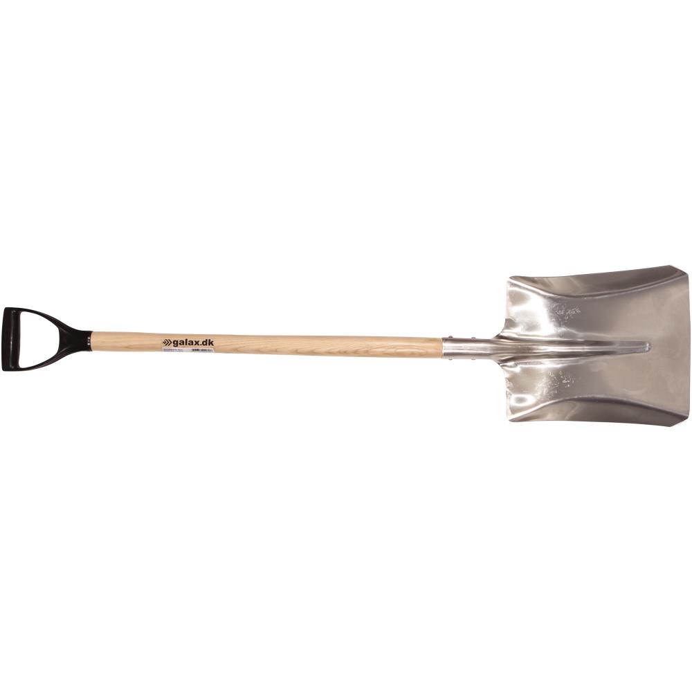Aluminium auto-/villaskovl med asketræsskaft og D-greb i plast. Skovlblad 340×250 mm. Fås i en kort og en lang variant.