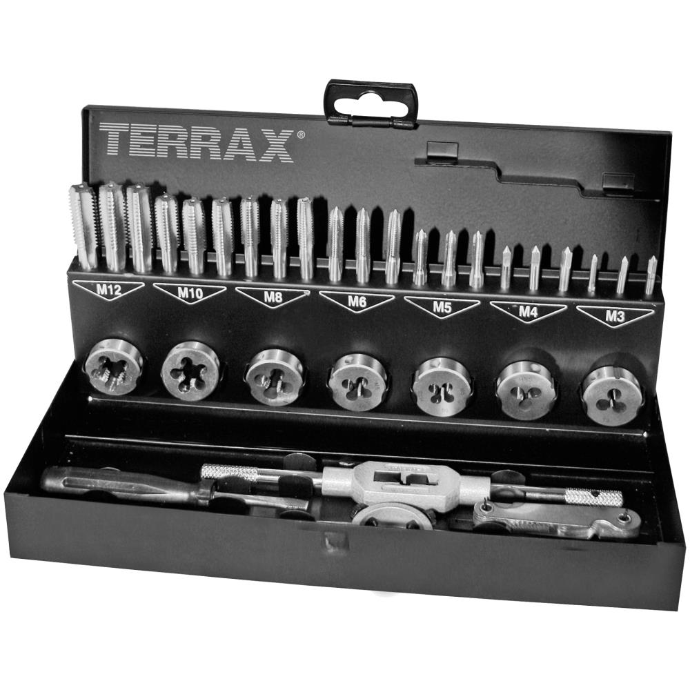 Terrax gevindværktøjssæt med 31 dele HSS M3-12. Indeholder håndtappe sæt med spids, mellem og bundtappe M3, M4, M5, M6, M8, M10, M12. Runde bakker HSS Ø25×8 mm M3, M4, M5, M6, M8, M10, M12. Vindejern Nr. 1.1/2, Ø-klup Ø25×9 samt skruetrækker til hobby og let håndværk.