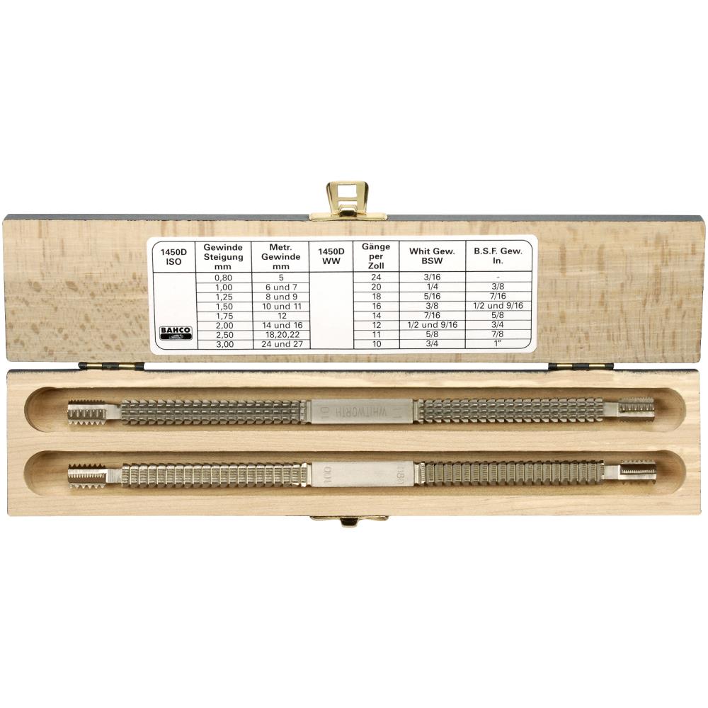 Sæt med 2 stk. dobbelte gevindfile til reparation af indvendige og udvendige gevind hhv. metriske og tommemål. Galvaniseret finish. Leveres i trææske med gevindtabel.