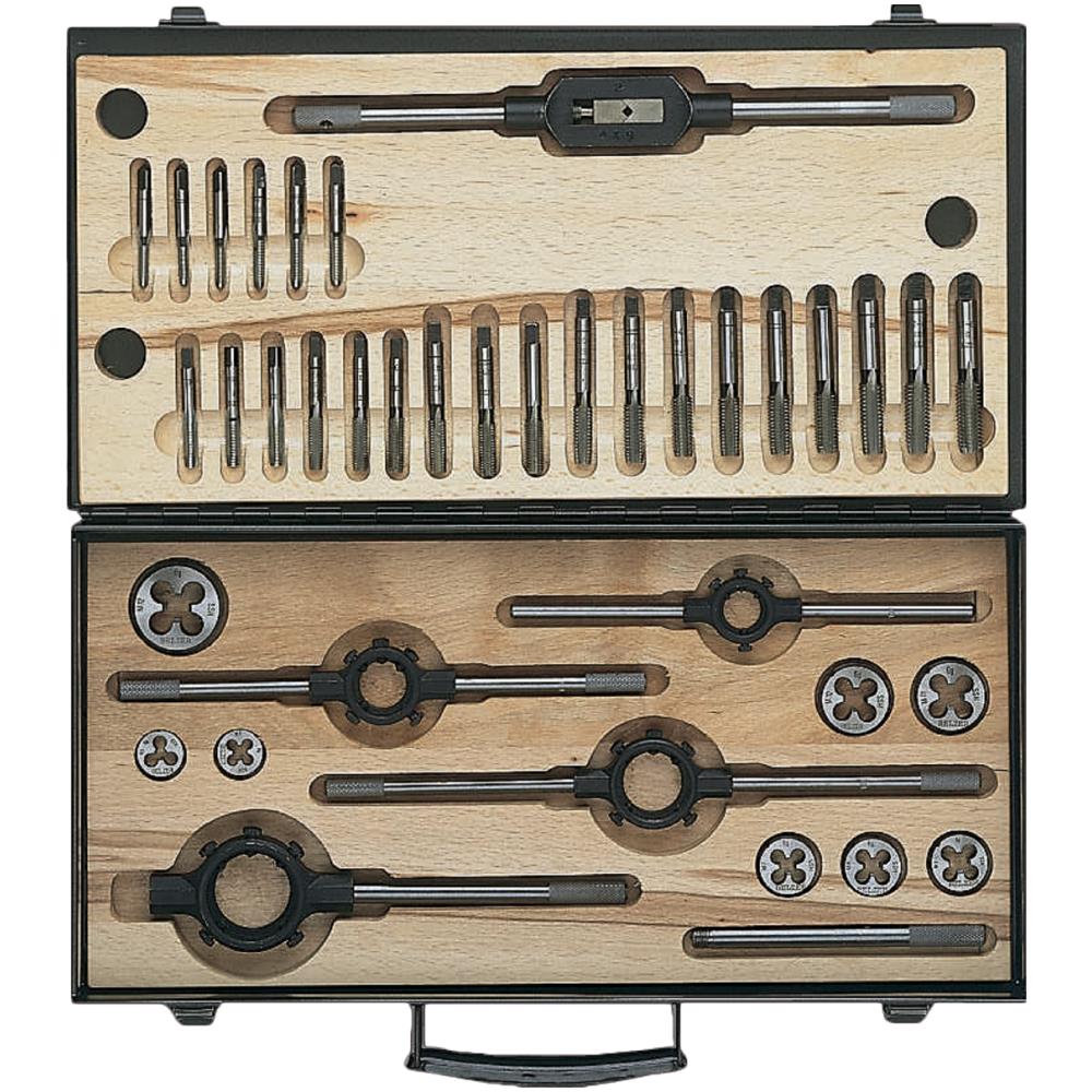 Gevindskærende værktøjssæt med DIN 352/ISO 6H snittappe, DIN 223/ISO 6G gevindbakker, DIN 1814 4-9 vindejern og DIN 225 klup. Til metrisk ISO-standardgevind M 5/6/7/8/9/10/11/12. Snittappe og gevindbakker fremstillet i højhastighedsstål. Polerede snittappe med slebne skær. Leveres i ovnlakeret, antracit stålkasse med indsats af træ. Sættet indeholder: 37 dele: 24 snittappe = 8 sæt med 3 stk. (spidstap, mellemtap og bundtap), 8 runde gevindbakker, 1 justerbart vindejern størrelse 2 og 4 kluppe 20×7, 25×9, 30×11, 38×14.
