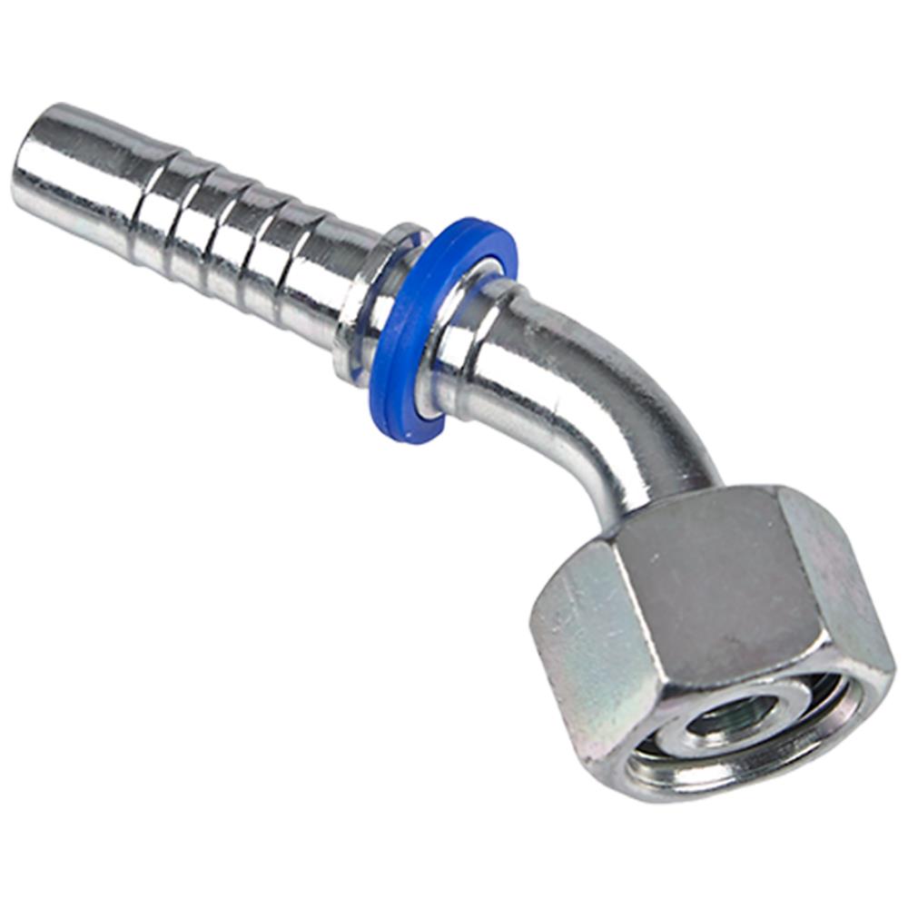 Hydraulisk kobling 45° DFOL4 tommer × metrisk hun 24° konus med o-ring, let serie 45° bøjning. Fås i flere dimensioner.