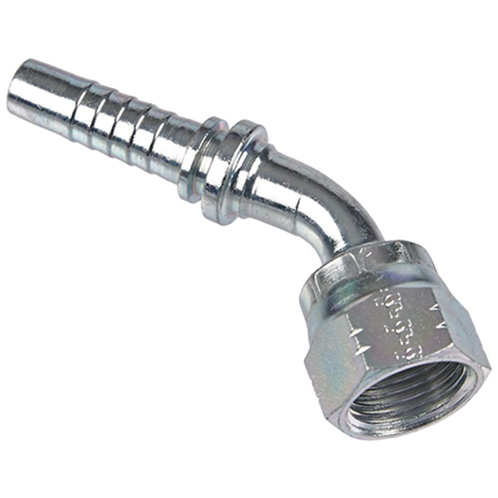 Hydraulisk kobling JF4 45° JIC hun 37° konus, 45° bøjning. Fås i flere dimensioner.