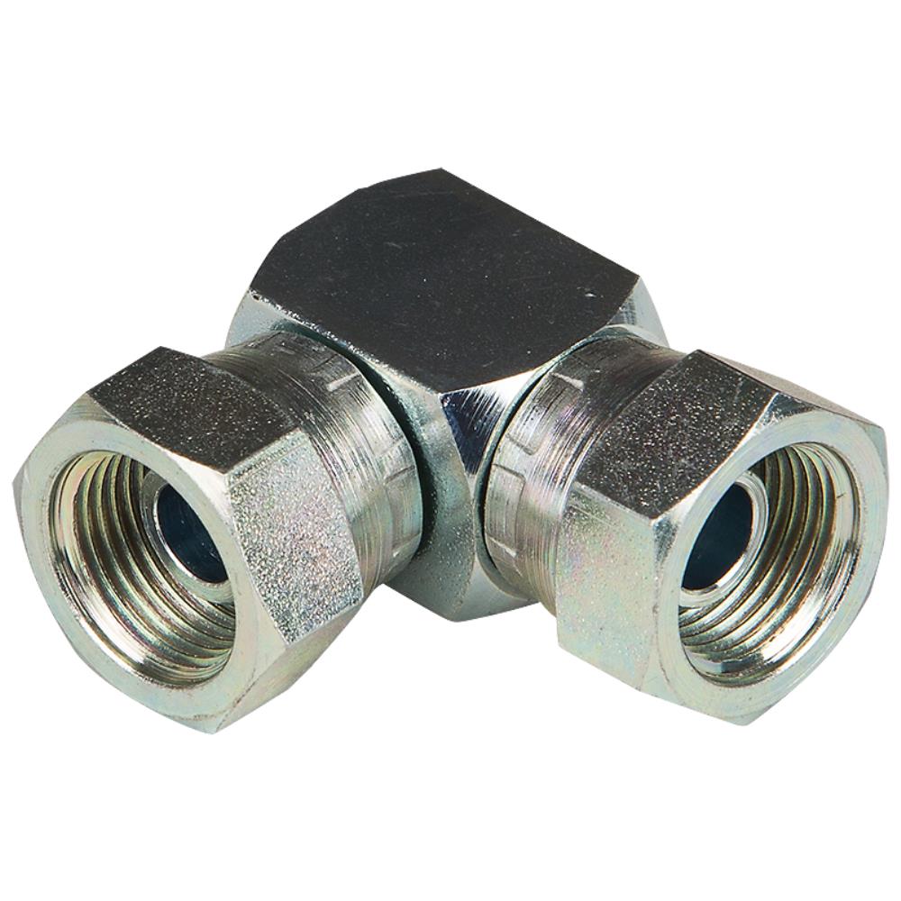 Hydraulisk kompakt vinkelnippel 90° med 2 omløbere BFFK9. BSP hun 60° konus × BSP hun 60° konus. Tommer. Fås i flere dimensioner.