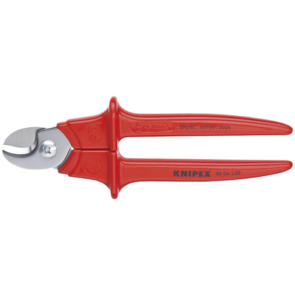 Kabelsaks isoleret, sprøjtet med kunststof, VDE-godkendt 230 mm. Til at skære Cu- og Al-kabler. Uegnet til ståltråd og hårdttrukne kobberledere. Hærdede skær med præcisionsslibning. Ingen sammenklemning, minimal deformering af kablet. Med klembeskyttelse. Justerbart skrueled. Saksekrop i kirurgistål, rustfrit, lufthærdet. Greb i kunststof, slagfaste. Til Cu-ledere, entrådede op til 16 mm², flertrådede op til 50 mm² og fintrådede op til 70 mm²- til Al-ledere, flertrådede 70 mm². Let skæring med enhåndsbetjening pga. høj udveksling. Rustfrit specialstål, hærdet og anløbet i olie.