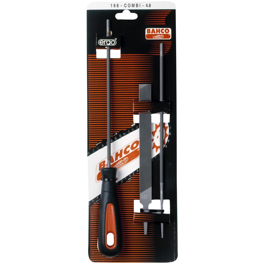 Kædesavfil sæt kombi 168 med filehæfte udviklet i henhold til Bahcos Ergo program. Sæt bestående af 2 stk. runde 8″ kædesavfile samt 1 stk. 6″ flad kædesavfil. SB forpakning. Fås i flere varianter.