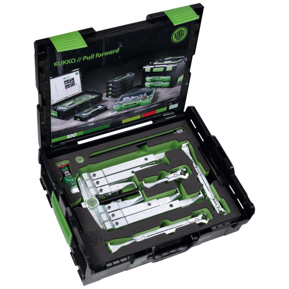 Serie K-2030-10 2- og 3-armet universalaftrækkersæt til aftrækning af lejer, tandhjul, skiver etc. Sættet muliggør sammensætning af otte forskellige aftrækkermodeller via kombinationen af aftrækningskrog og forlængelser. Fleksibel i brug med sine to eller tre arme. I enhver position, selv under fuld belastning, parallelle aftrækningskroge. Trinløst forskydelige aftrækningskroge på traversen. Optimal tilpasning af spindlerne til akslen vha. 2-sidet spindelspids (kugle og spids). Korte og lange mekaniske spindler. Specialcoatet, valset gevind. Betjeningsvejledning i dækslet. Inkl. personlig KUKKO-chip-kode. Leveres i kuffert.