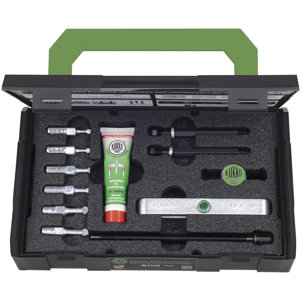 Kukko aftrækkersæt 69-A til aftrækning af lejer i hus med aksel i. Trækker inden i lejet, og kan tage følgende leje str. 6004-6013, 6201-6206, 6300-6305