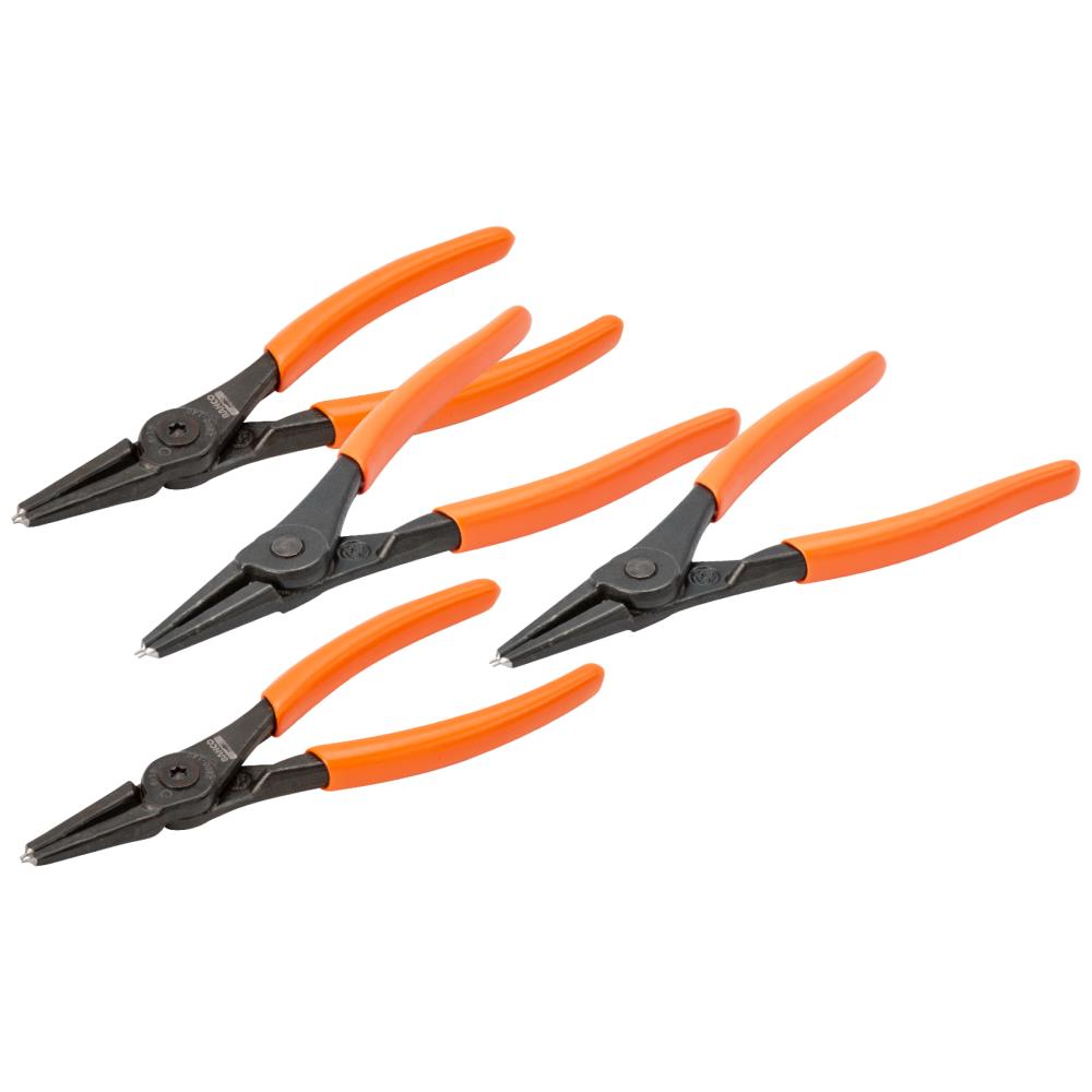 Låseringstangsæt med fire dele til håndtering af indvendige og udvendige låseringe. PVC-belagte håndtag. Højtlegeret stål. Fosfat finish, anti-korrosionsbehandlet. Indvendige uden returfjeder, udvendige med returfjeder. Med lige kæber, smedede spidser.