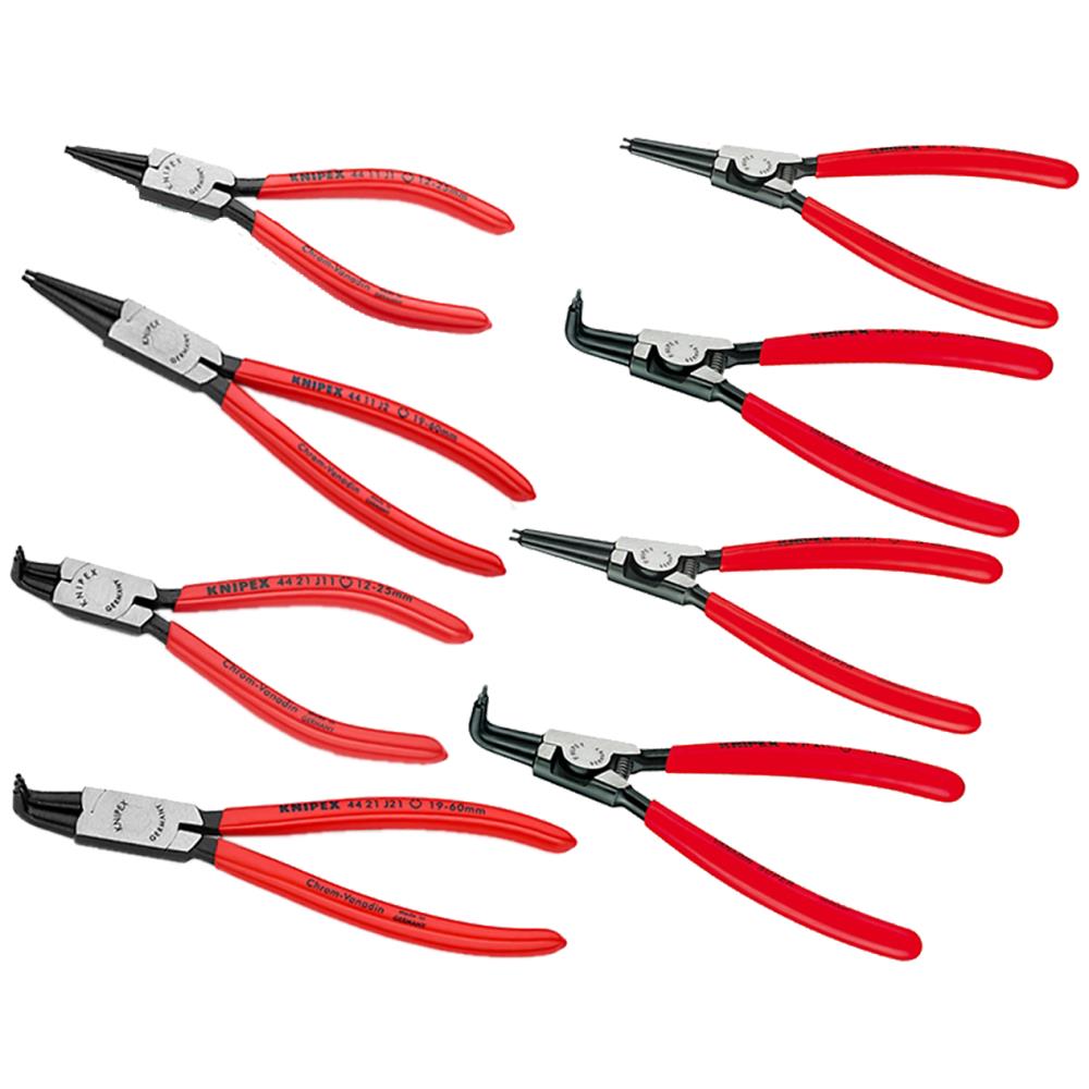 Låseringstangsæt med 8 dele. Sættet indeholder 4 stk. låseringstænger til indvendige ringe i boringer, hhv. J1 (12-25 mm) og J2 (19-60 mm) med lige spidser samt J11 (12-25 mm) og J21 (19-60 mm) med 90° buede spidser, og 4 stk. låseringstænger med åbningsfjeder til udvendige ringe på aksler, hhv. A1 (10-25 mm) og A2 (19-60 mm) med lige spidser samt A11 (10-25 mm) og A21 (19-60 mm) med 90° buede spidser. Leveres i robust kunststofemballage, som kan anvendes til opbevaring.