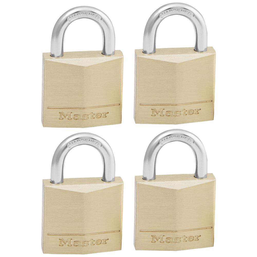 4 stk. Master Lock enslukkende hængelåse i massiv messing der sikrer styrke, holdbarhed og korrosionsbestandighed. Bøjlen er lavet af hærdet stål, som gør den svær at klippe eller save over. Velegnet til indendørs brug. Fås i flere varianter.