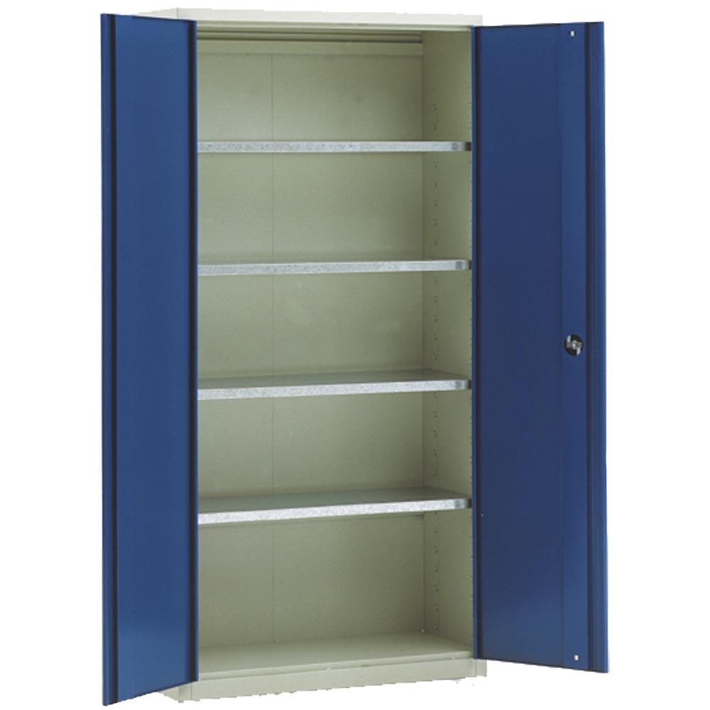 Robust og rummeligt materialeskab med masser af opbevaringsplads. Design med fleksibel indretning, som dækker behovet for opbevaring af værktøj, maskiner, arbejdstøj, dokumenter, bits, søm osv. Låger med udvendige hængsler åbner 180°. Hylderne kan flyttes uden brug af værktøj og har en belastningsevne på op til 60 kg. Fremstillet af fuldsvejst stålplade. Lysningsmål (H×B×D): 1.870×920×425/580 mm. Udvendige mål (H×B×D): 2.000×1.000×445/600 mm. Fås i flere varianter.