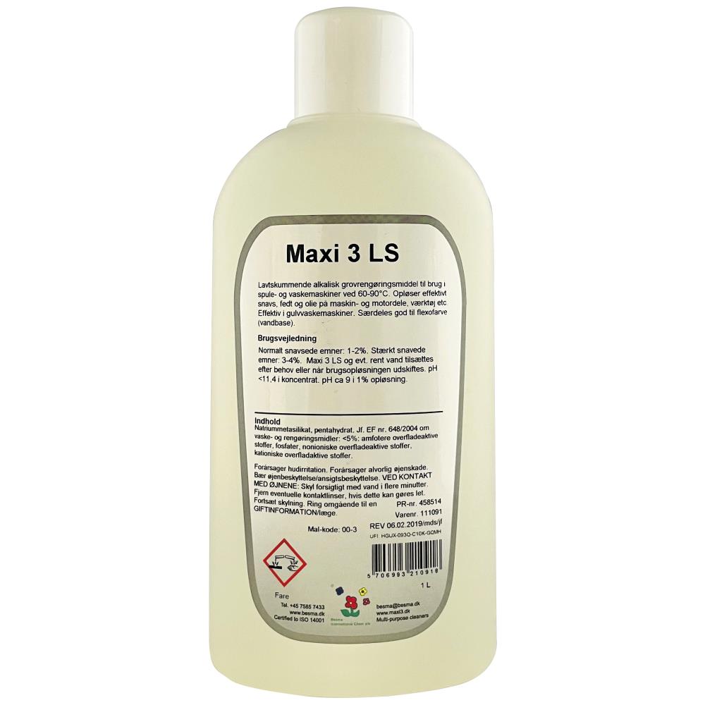 Maxi 3 LS er en lavtskummende alkalisk rensevæske/affedtning til brug i spule- og vaskemaskiner (også gulvvasker). Særdeles god til flexofarver (vandbase). Supereffektivt, optimal virkning ved 60°-90°C. Produktet er hurtigt separerende i den anbefalede brugsopløsning. Biologisk nedbrydeligt. pH-værdi koncentrere <11,4 og pH-værdi i 1 % opløsning ca. 9. Fås i flere varianter.