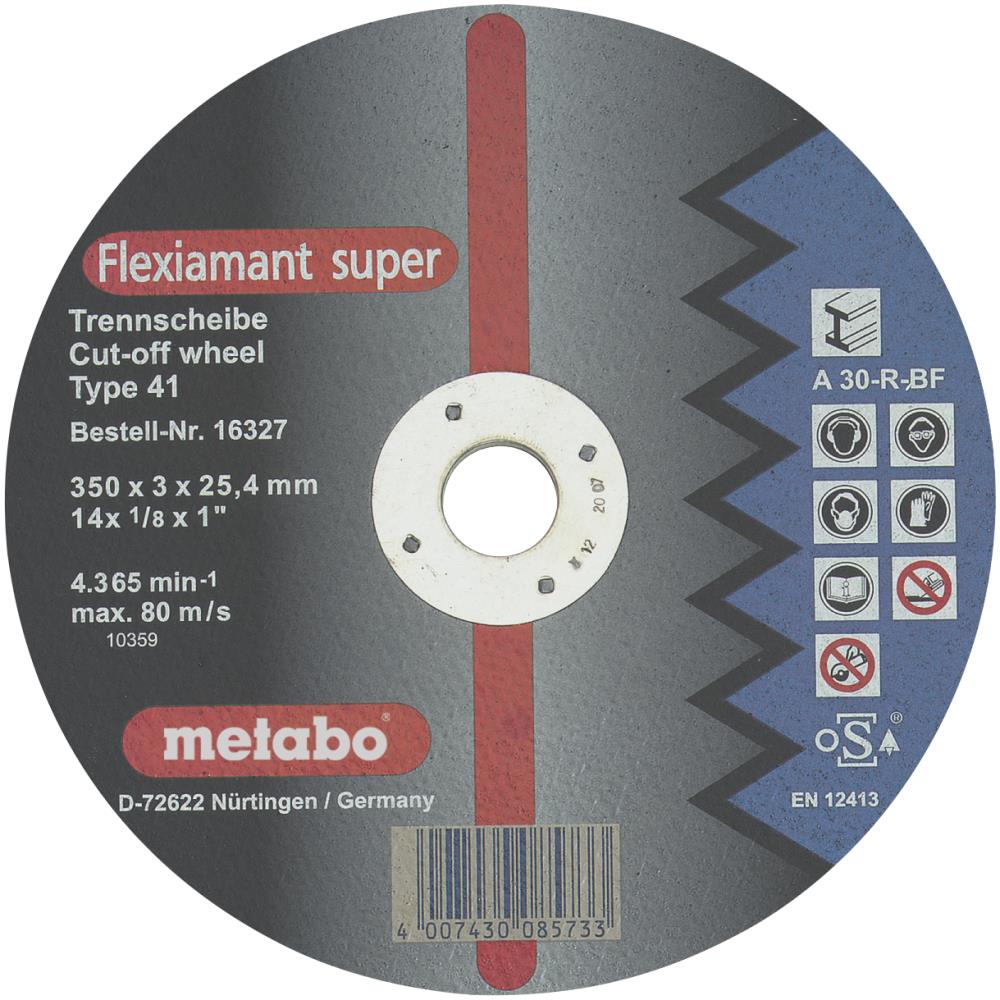 Skæreskive til metal. God skæreydelse i forbindelse med høj levetid i forbindelse med stål. Hård udførelse til ydedygtige maskiner (maskinbelastning > 3 kW). A 36-S: Med indvendigt væv til hurtige snit. Højeste arbejdshastighed 80 m/s. Fås i flere dimensioner.