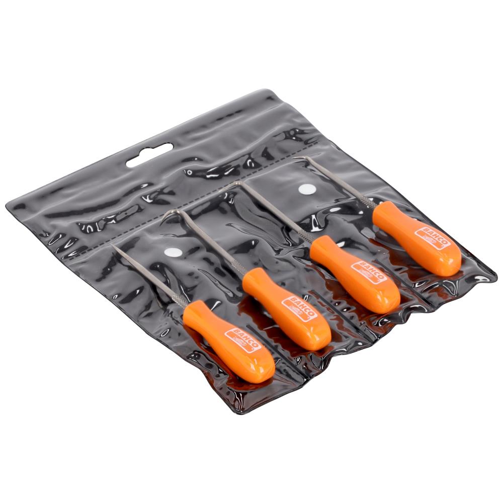 Miniværktøjssæt bestående af 4 dele. Syl og kroge til fjernelse/tilpasning af O-ringe, rensning i hjørner og riller. Kan benyttes til at lave huller i læder og andet stof. Skaft af plastik og rustfri klinge. 2633/S4 totallængde 130 mm. 2633L/S4 totallængde 250 mm.