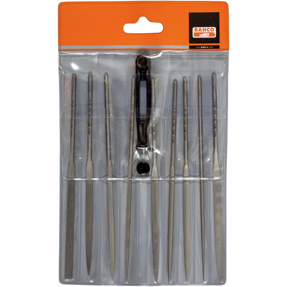 Nålefilesæt med 9 dele. Nålefile med mellem-hugning til finfiling og polering – fortrinsvis ved gravørarbejde, finmekanik, instrument-, guldsmede- og urmagerarbejde. Sættet indeholder 1 stk. af hver af typerne: ansats, flad, halvrund, rund, trekant, firkant, oval, fugletunge og kniv samt 1 stk. nålefilehæfte. Leveres i praktisk opbevaringslomme.