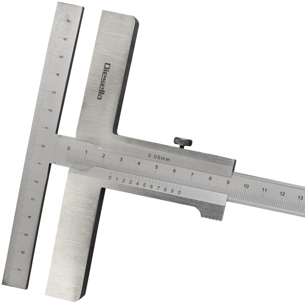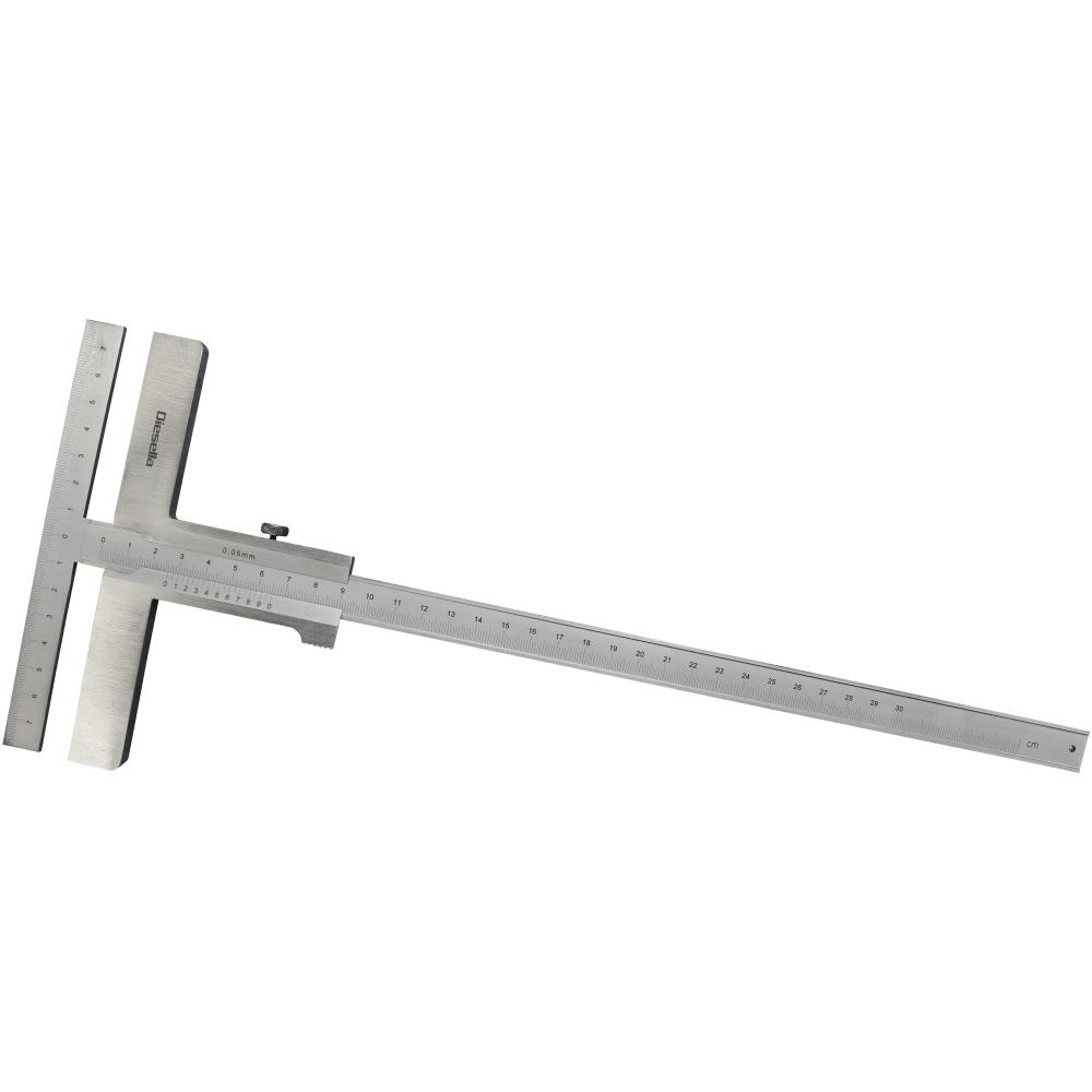 Opmærkningslære til opmærkning på plader. Model med kraftigt, poleret anlæg og matforkromet målestav og nonius. DIN 862 standard. 0,05 mm aflæsning. Fås i flere varianter (variant angivet som opmærkningsområde × ansatslængde).