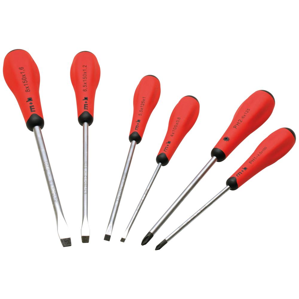 RedGrip skruetrækkersæt med 6 dele til ligekærv- og Phillips-skrueforbindelser. Skruetrækkerne er med rødt tokomponent-håndtag, som sikrer optimal grebkomfort. Den sorte, hårde specialplastkerne modstår de højeste belastninger. Konisk håndtag til høj, nem kraftoverførsel. Praktisk farve- symbol-/størrelsesmarkering. Klinge af kromvanadiumstål. Sættet indeholder: lige 4×100 mm, 5,5×125 mm, 6,5×150 mm, 8×150 mm, PH1, PH2.
