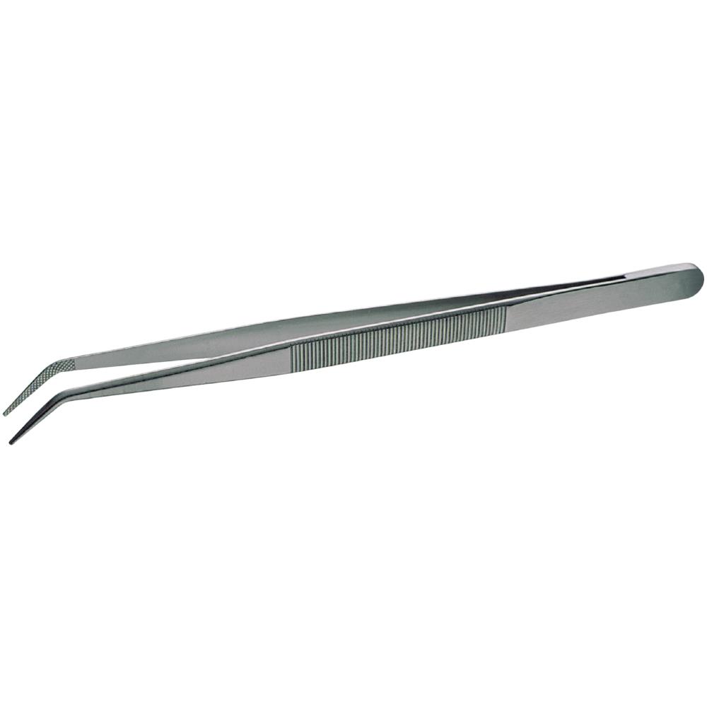 Stærke dobbelt bukkede spidser og riflede gribeflader. Materiale: Rustfast stål, antimagnetisk, syrefast. Finish: Poleret.