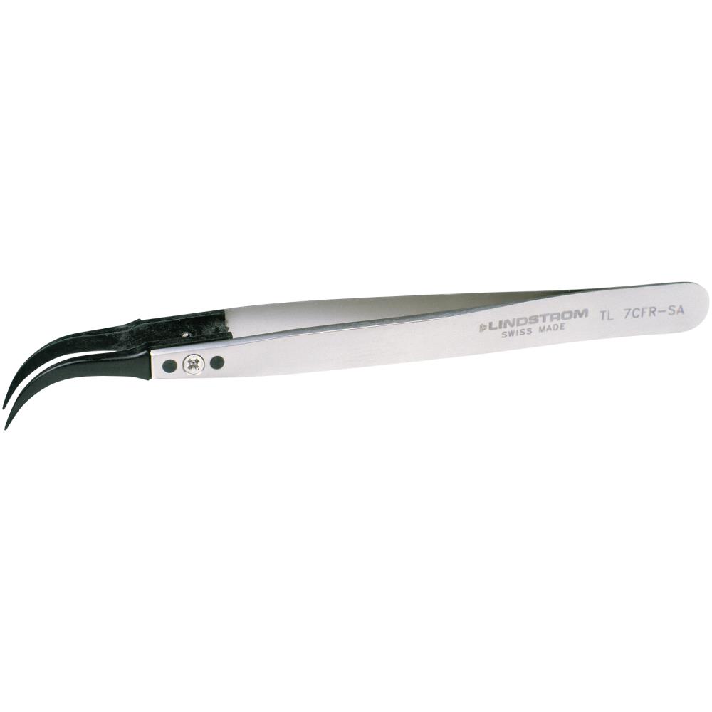 Pincet med fine, bukkede spidser. Materiale: Rustfast stål, carbonfiber spidser. Finish: Poleret.