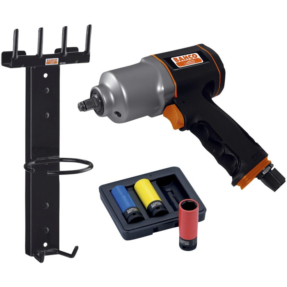 Slagnøglesæt 1/2″. Indeholder: 1 stk. BP815 1/2″ slagnøgle. 1 stk. BP500 Magnetisk værktøjsholder. 1 stk. BWSS12P Slagtoppe med plastovertræk 17, 19, og 21 mm.