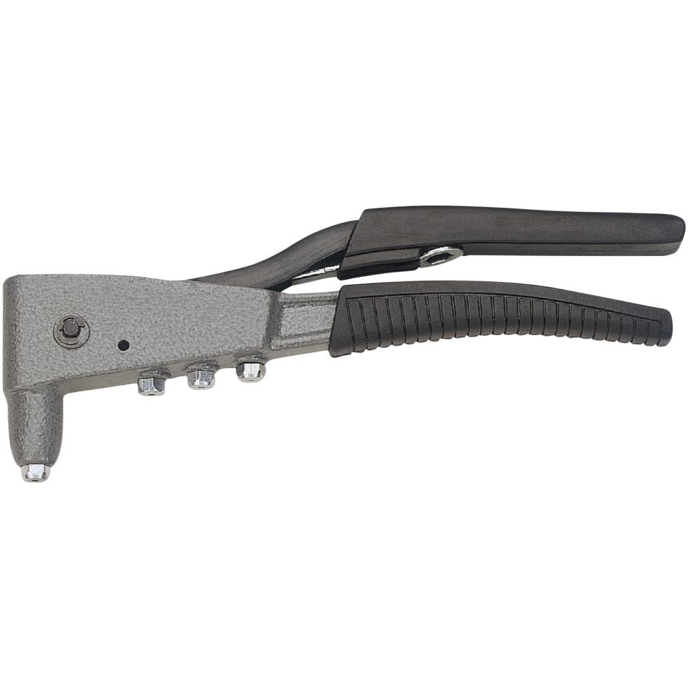 Universal popnittetang, med 4 forskellige, udskiftelige hoveder: 2,4 – 3,2 – 4,0 – 4,8 mm. Leveres med nøgle til at løsne/spænde hovederne.