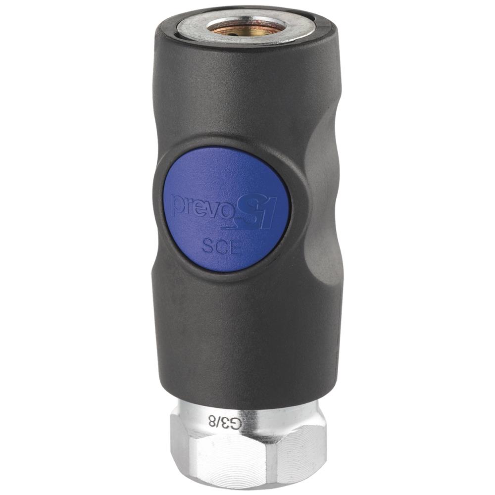 Serie 009 sikkerhedskobling med trykknap. 1 tryk, 1 teknologi, 1 serie. Ekstrem nem og sikker til-/frakobling blot ved ét tryk. Automatisk udluftning ved frakobling. Heavy-duty kompositmateriale, antistatisk, ultra lav vægt og stort flow (2.100 ltr./min.)