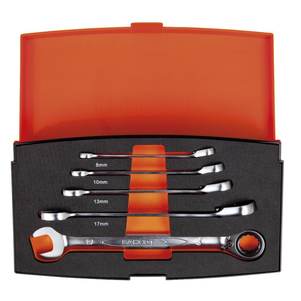Ringskraldenøglesæt med 5 nøgler (8-10-13-17-19 mm). Skraldefunktion i ringen og med omskifter for hurtig ændring af højre og venstre omløb. Forsynet med “dropstop”, der sikrer, at nøglen ikke glider ned over møtrikken.